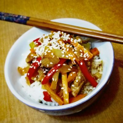Ингредиенты:Свинина;Лук;Морковь;Болгарский перец;Рис длиннозерный пропаренный;Приправа Кнорр для Свинины в кисло-сладком соусе;Перец и соль;Масло подсолнечное для жарки;Кунжут для украшения;Крахмал;