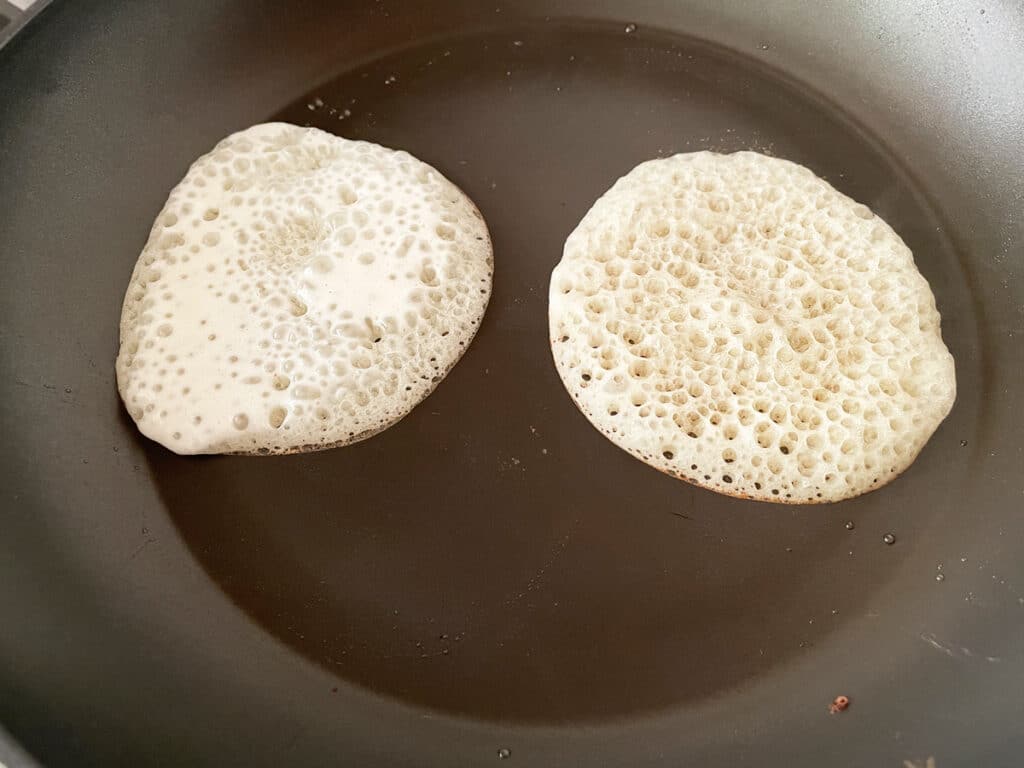 Разогреваем сковороду. Наливаем половник теста на сковороду, уменьшаем огонь до малого и печем блины. Марокканские блинчики пекутся только с одной стороны.
