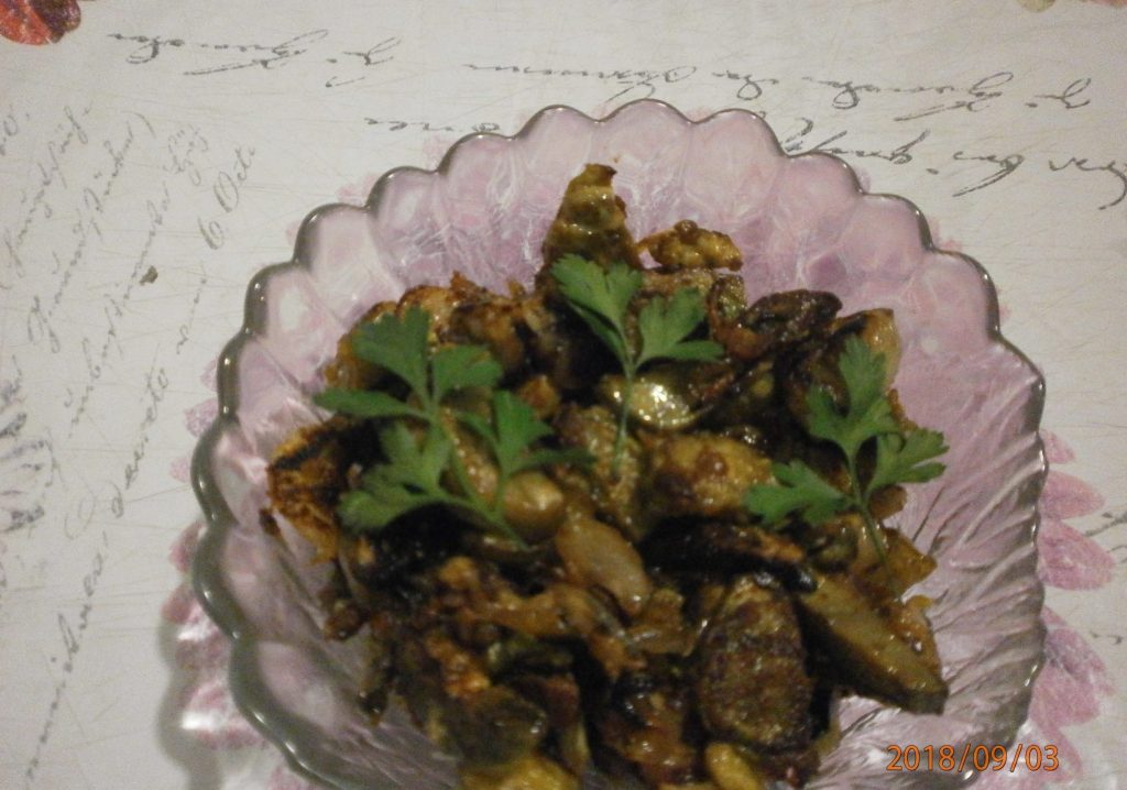 Шаг 11. Нам понадобится: 5 небольших «синеньких», 3 яйца, 3 – 4 луковицы шалот(в простонародье кущевка) среднего размера, майонез (можно низкокалорийный), грибная сыпучая приправа или кубики, растительное масло.
