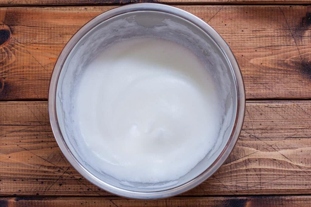 В глубокую миску разбить яйца, отделив белки от желтков. Отдельно взбить миксером белки, до пышной белой массы. Добавить половину сахара, снова взбить миксером.
