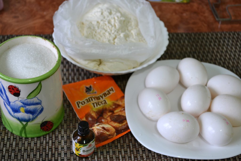 Шаг 1Для начала нам нужно подготовить продукты: яйца, сахар и муку, а также разрыхлитель и ваниль.