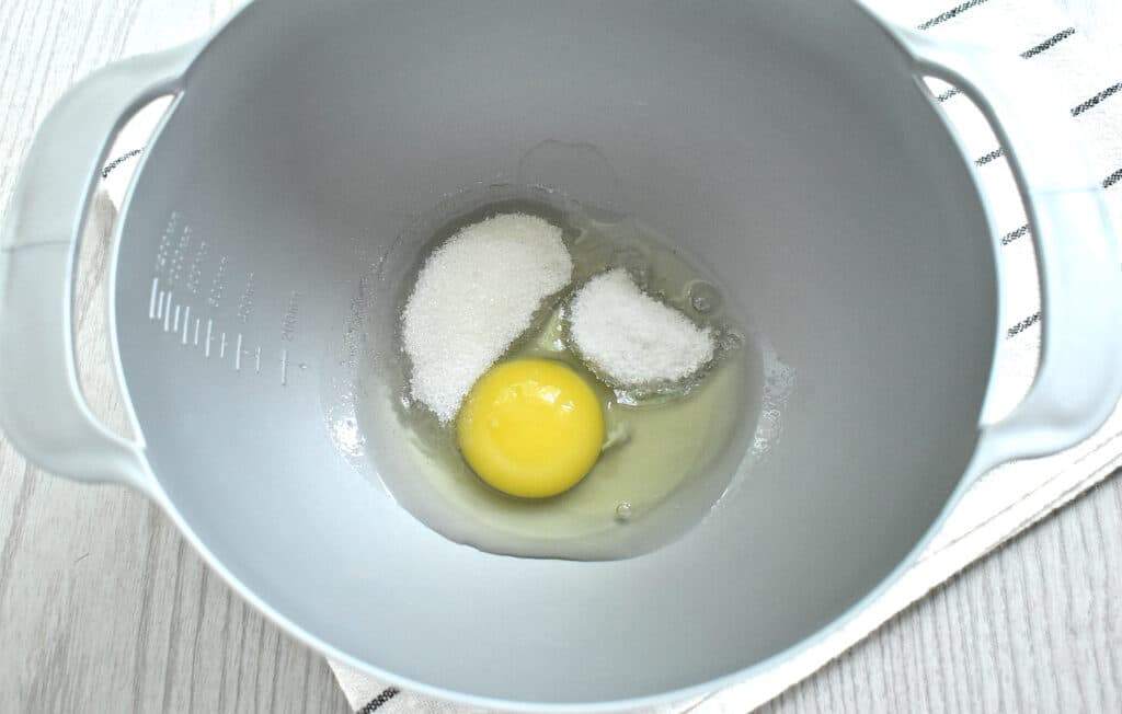 Шаг 1В миску разбиваем яйцо. Всыпаем к нему сахар и соль.