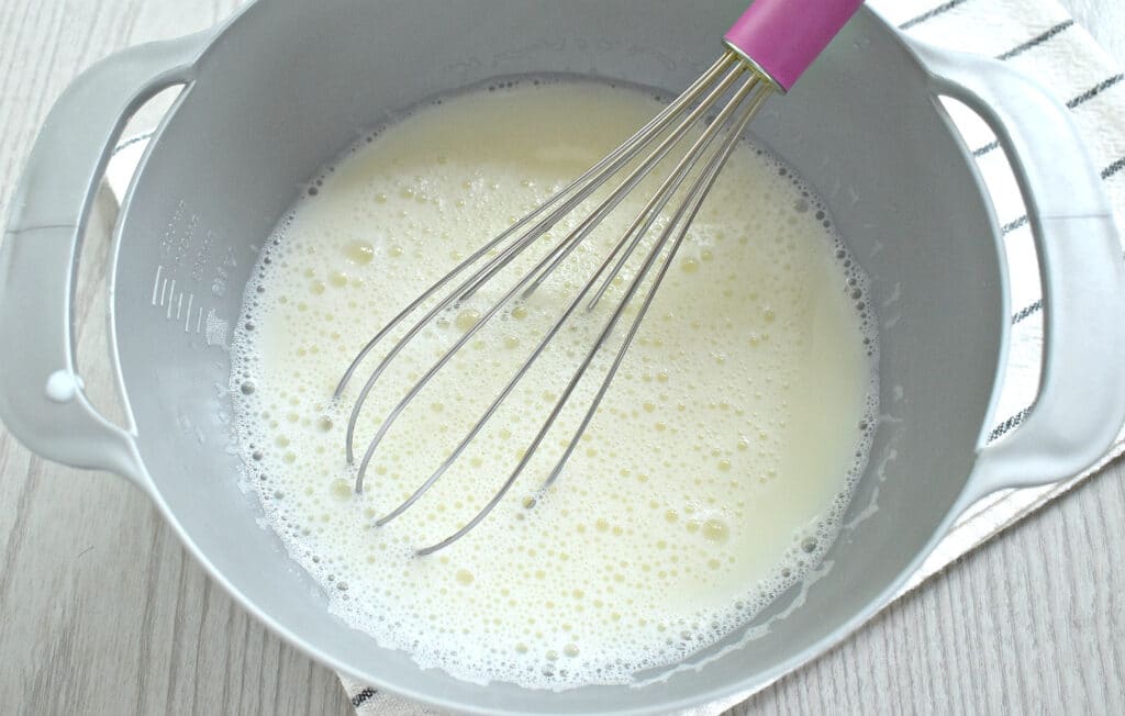 В яичную массу выливаем кипяток, сразу быстро перемешиваем. Следом вливаем холодное молоко и снова хорошо перемешиваем.