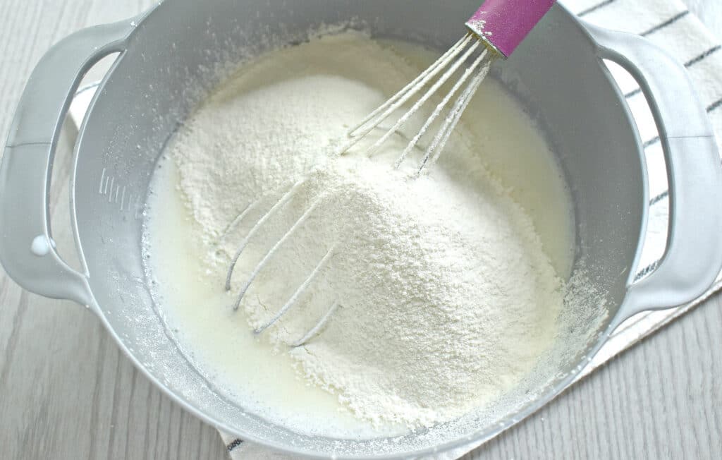 Просеиваем муку, перемешиваем так, чтобы тесто было без комочков.