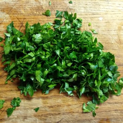 3. Петрушку помыть, хорошо стряхнуть воду и мелко нарезать. Добавить к творогу.