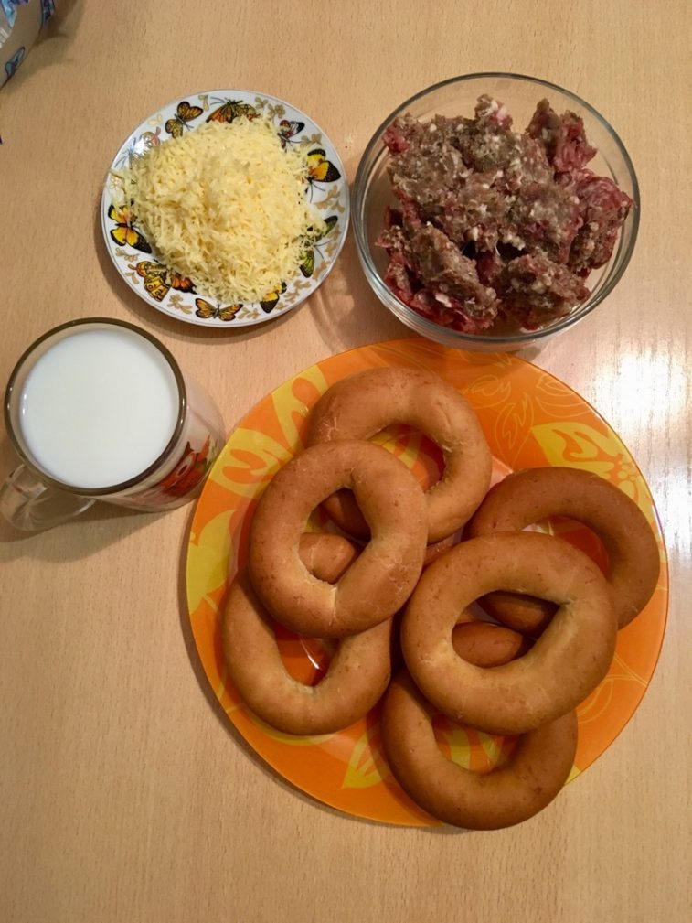 Шаг 1Для приготовления нам понадобиться бублики несладкие 6 штук, любой мясной фарш (говядина, свинина) 300 грамм, лук, соль, перец молотый, твердый сыр 100 грамм, литр молока.