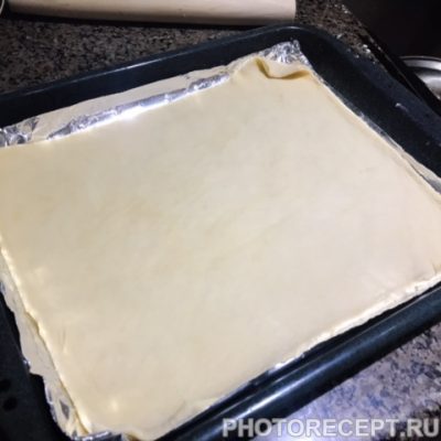 Раскатываем первую часть, укладываем на противень с фольгой, смазанной растительным маслом.