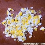 Делаем первую начинку: чистим и мелко режем лук, чистим и режем квадратом 4 вареных яйца.