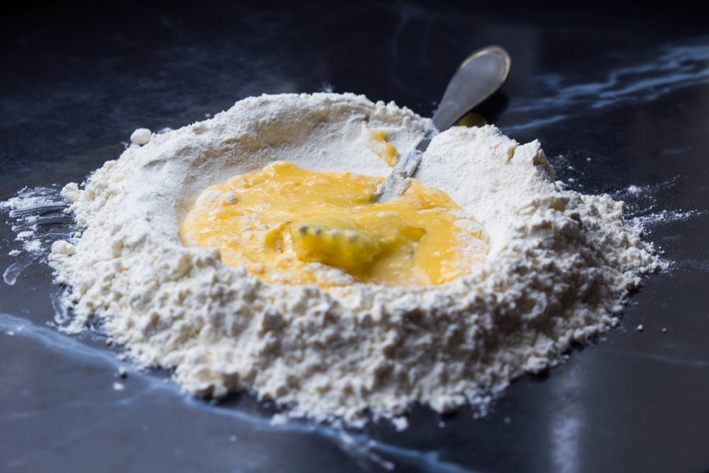 Добавляем щепотку соли и аккуратно взбалтываем яйца. Постепенно подмешиваем муку и замешиваем крутое тесто.