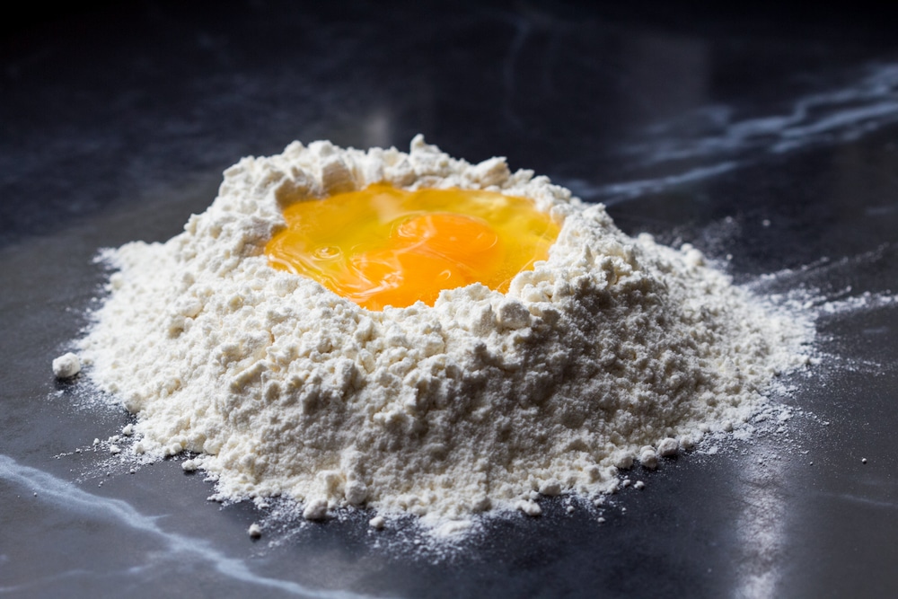 Шаг 1Просеиваем муку на стол, делаем из нее горку. Сверху горки, делаем рукой углубление.