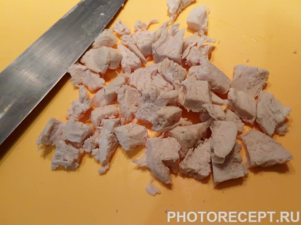 Копчености нарезаем по выбору тонкими полосками или небольшими кубиками.