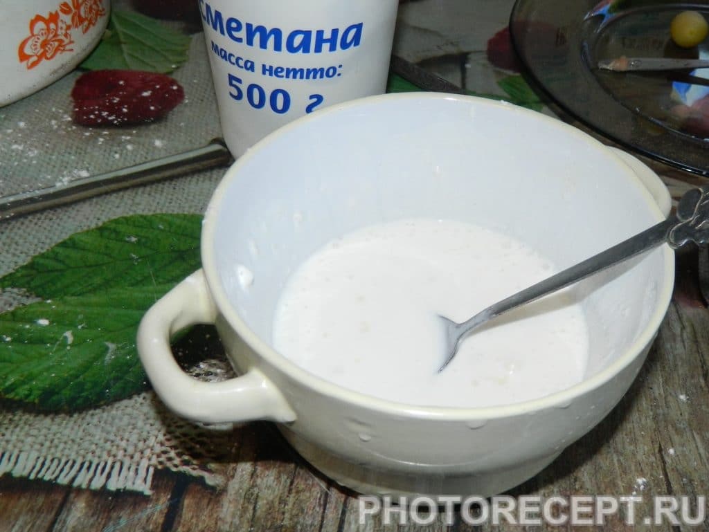 Пока ежики поджариваются, подготовьте сметанный соус. Разведите 1 ст. ложку муки в 150 мл воды, хорошо перемешайте, чтобы не было комочков. Добавьте в тарелку сметану и еще раз все хорошо перемешайте. Соус должен быть консистенции не жирного кефира.