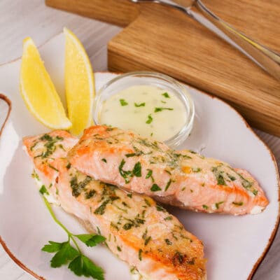 Филе со сливочным соусом получается невероятно нежным и вкусным. В таком варианте лосось понравится даже тем, кто не любит рыбы и морепродуктов. Гарниром может быть рис, беспроигрышный вариант. Кусочки лимона на блюде будут не только украшением, которое превратит блюдо в ресторанный шедевр, а и тонким дополнением вкуса лимона к филе.