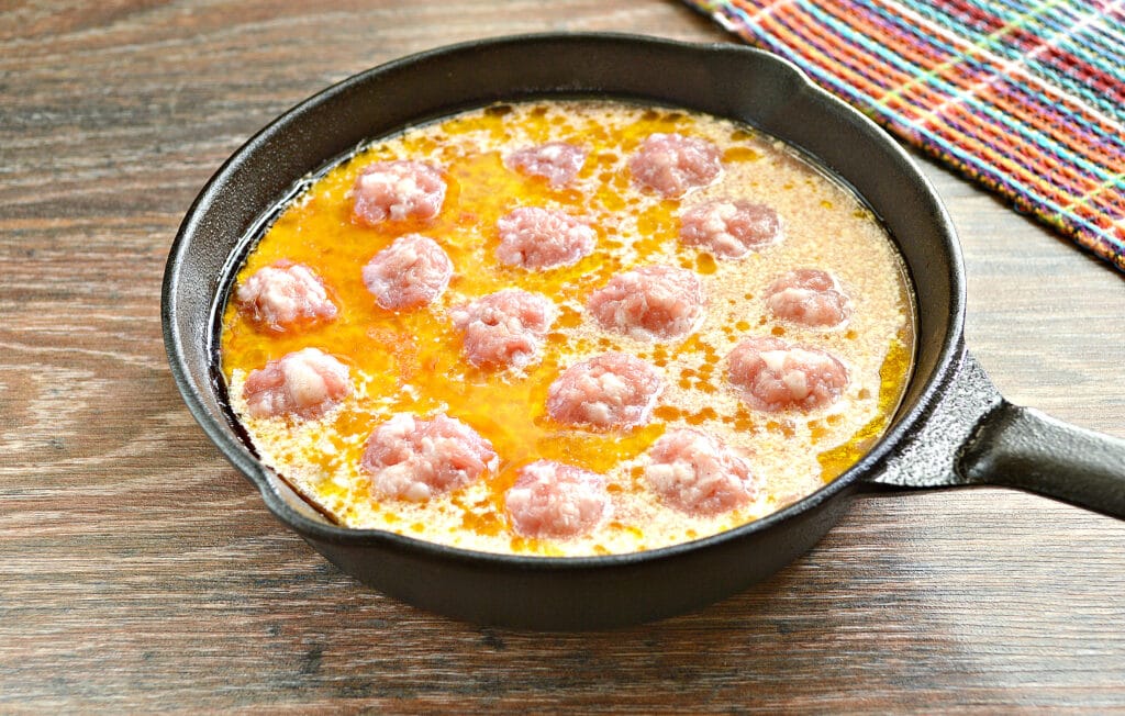 Томатную пасту смешиваем с майонезом и порцией кипяченой воды. Получившуюся заливку добавляем к фрикаделькам на сковороду.