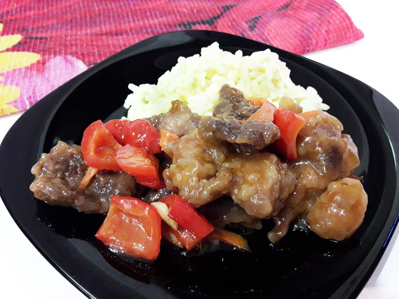 В соус отправляем обжаренное мясо, добавляем немного крахмала, если соус получился слишком жидкий. Перемешиваем так, чтобы каждый кусочек покрылся соусом. Оставляем на огне еще 5 минут.