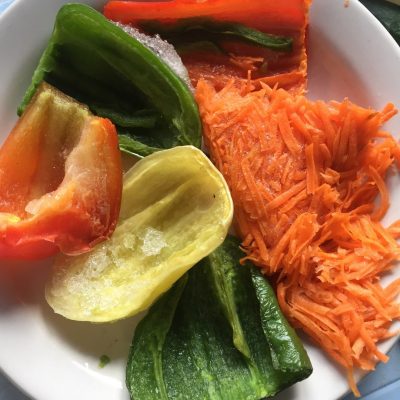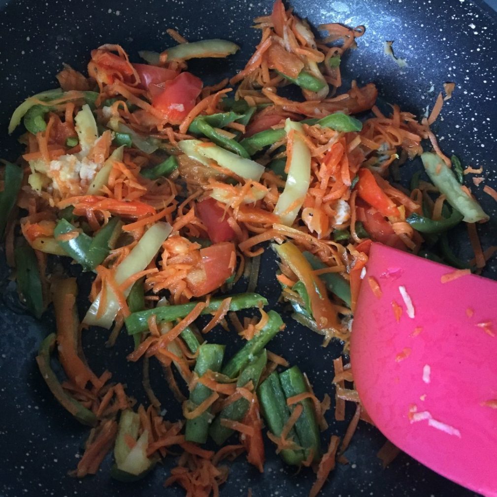 2. Морковь натираем на терке, перец нарезаем соломкой, огурец режем ломтиками. Мелко натираем чеснок. Все эти овощи кладем в антипригарную сковороду или добавляем немного растительного масла.