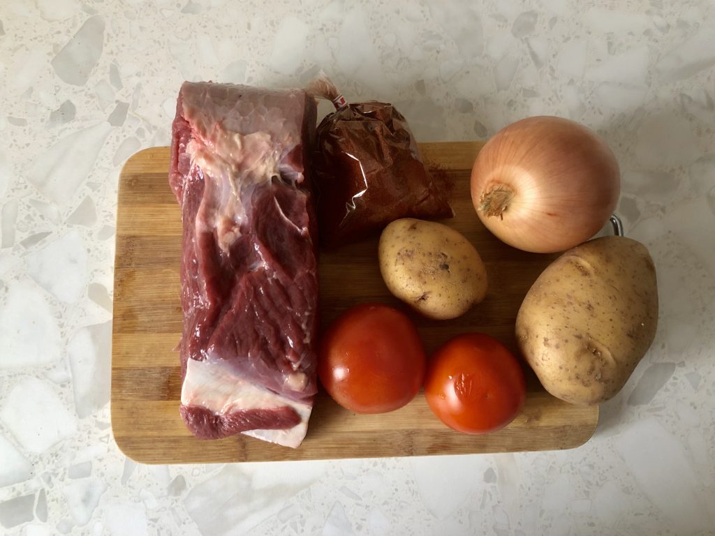 Режем луковицу на средние брусочки, мясо кубиками. Все ингредиенты не нужно нарезать мелко. Наливаем в кастрюлю с толстым дном и стенками оливковое масло, пассируем в ней лук до прозрачности на большом огне. После чего засыпаем паприку. Постоянно перемешиваем.