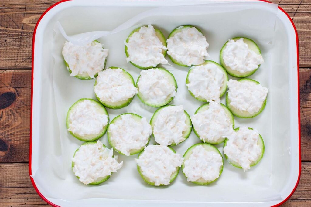 Посыпаем кабачки солью и перцем. Майонез (или сметану) смешиваем с чесноком и сыром. Кладем начинку на каждый кусочек.