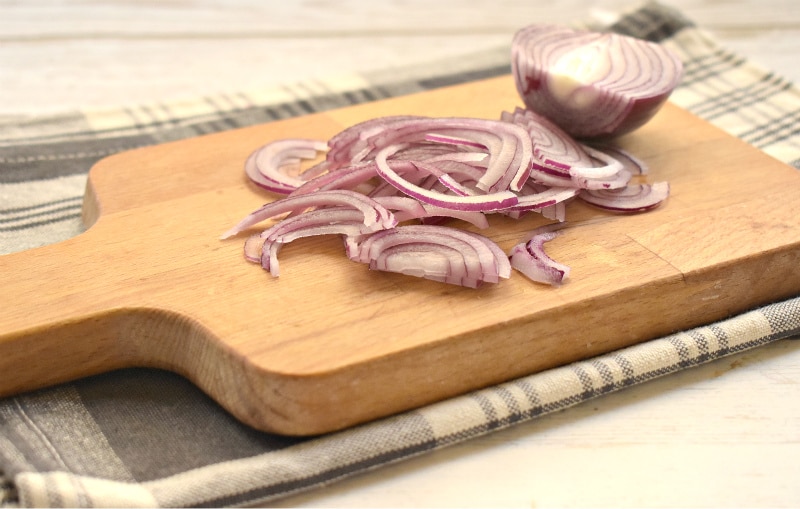 Красный лук для нашего салата нарезаем тонкими полукольцами.