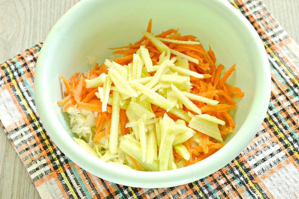Часто белокочанная капуста используется для приготовления салатов. Капуста отлично сочетается с овощами. Мы использовали это гастрономическое качество продукта и использовали в салате еще морковку, кислое яблоко. Для заправки капустного салата подготовьте уксус, растительное масло, лимон. Остальные подробности – в кулинарном описании.