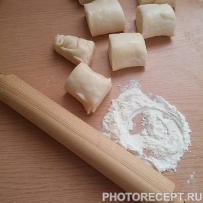 После того как тесто полежало в холодильнике ,достаем его,режем на части примерно по 5 см,раскатываем в кружечки каждую часть,под размер самсушек. Начиняем нашим фаршем и слепляем концы,чтоб получилась форма круга.