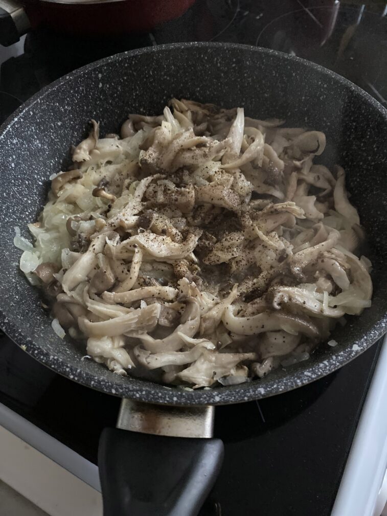 К луку добавим грибы и перемешаем, обжариваем без крышки, чтобы испарилась влага.