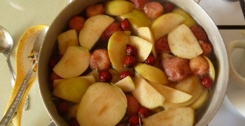 Компот, сваренный из свежих яблок с добавлением клубники, несет эмоциональный вкус, яблоко словно наполняет воду вязкостью, а клубника придает восхитительный аромат, будоражащий дух, а если добавить в этот компот немного шиповника, его легко сделать находкой для повышения иммунитета.