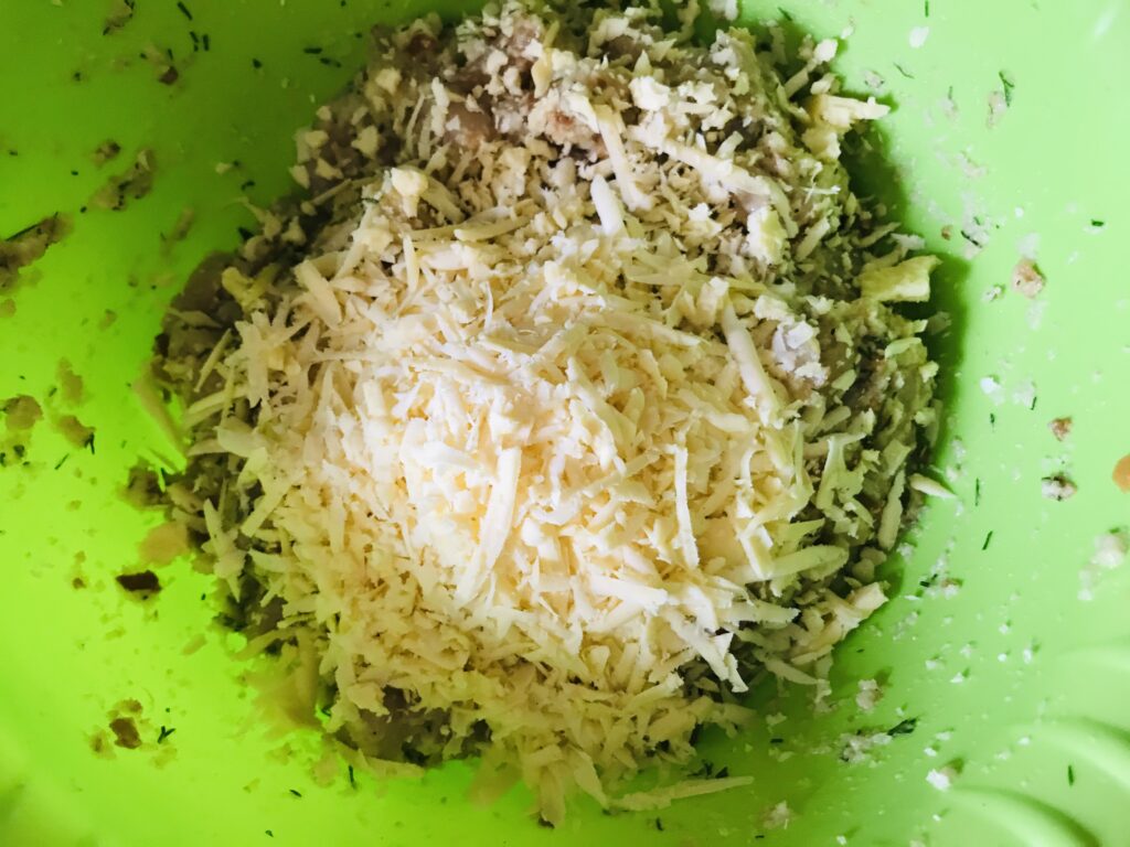 Далее натираем сыр на крупную терку и снова все тщательно перемешиваем. Можно приступать к формированию котлет.