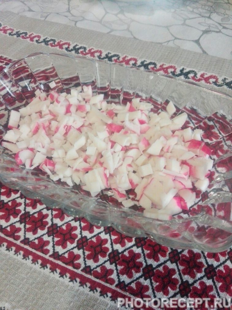 Шаг 1Подготовим необходимые ингредиенты для салата. Крабовые палочки порежем мелкими кубиками.