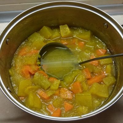 4. Добавить морковь к тыкве, залить водой, посолить и варить до готовности.