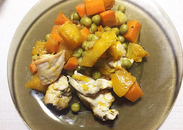 Чистим и нарезаем яблоки и мандарину, добавляем на сковородку. Открываем банку горошка, промываем, добавляем ,накрываем крышкой. Тушим пять минут. Солим,перчим и добавляем немного розмарина. Перед подачей полила соевым соусом Терияки, но это каждый может делать на свой вкус) Приятного аппетита)