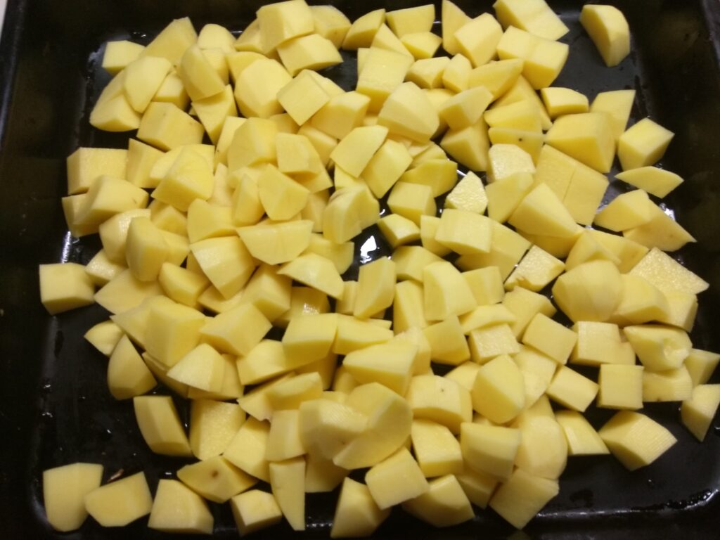 Шаг 11. Картофель очистить, помыть и нарезать крупными кусками. Сложить в противень. В противень предварительно влить растительное масло.