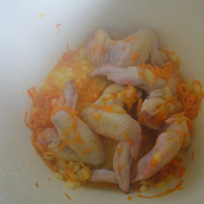Ножом от кожуры чистим сырой картофель, нарезаем его в форме кубиков. Куриные крылышки промоем в воде, подсушим. К поджаренным морковке, луку опускаются промытые крылья. Всё перемешивается, даем крыльям "схватиться".