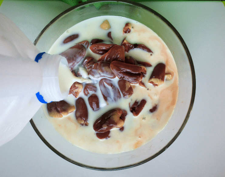 После того как очистите куриные сердечки их необходимо сложить в чашку и залить молоком. (Есть еще вариант использовать вместо молока газированную воду, получается тоже вкусно). Оставить вымачиваться сердечки под молоком на 30 минут при комнатной температуре.