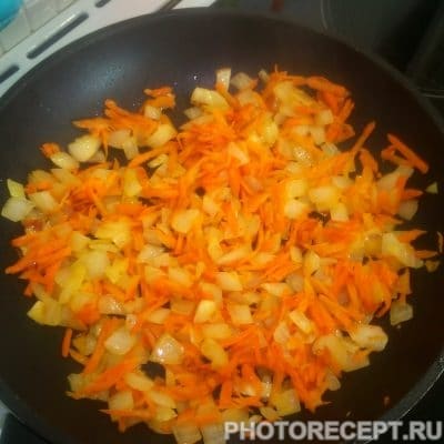 Лук режем маленькими кубиками. Морковь трем на большой терке. Отправляем в разогретую сковороду с растительным маслом. Жарим до готовности, чуть золотистой корочки. Пережаривать не стоит, так как привкус погорелого испортит весь суп.