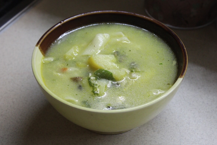Всыпать в суп нарезанный зеленый лук. Добавить после того, как все ингредиенты будут готовы - за пять минут до окончания приготовления.