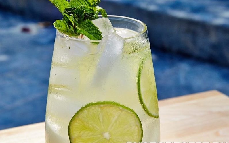 Перед подачей коктейль надо процедить! Нарезать кружки лайма, забросить в стаканы лед и кружки фрукта, залить напитком. Украсить коктейль можно веточкой мяты.