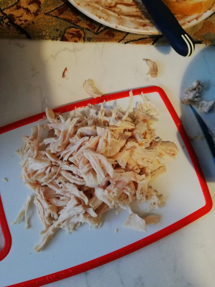 Варим примерно 100 или 200 г куриной грудки (все зависит от ваших предпочтений), затем режем ее на небольшие кусочки. Все ингредиенты помещаем в чашу и начинаем готовить соус.