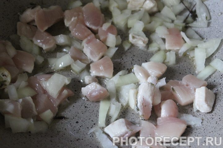 Добавить на сковородку к травам курицу и нашинкованный лук.Обжаривать до готовности.