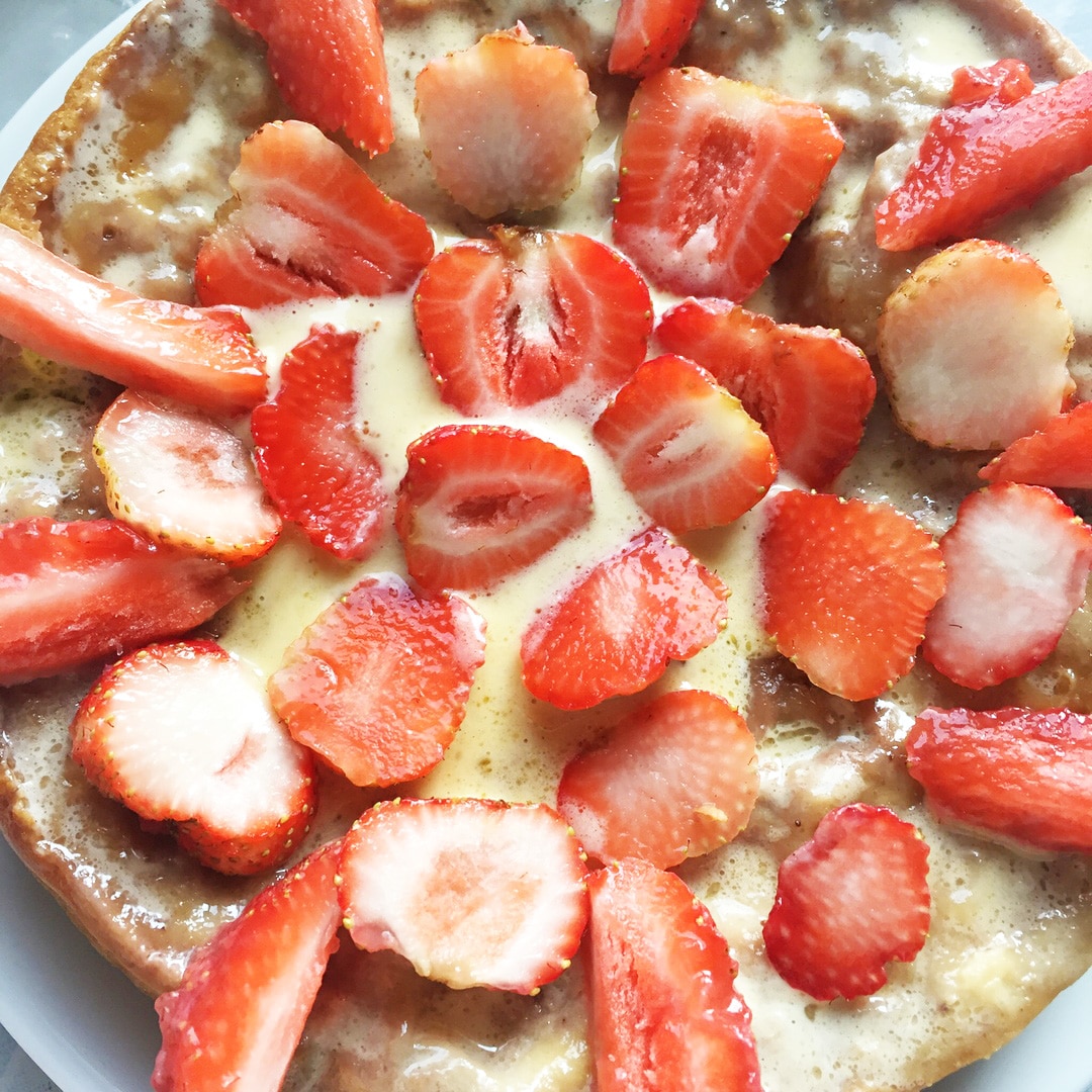 5. Затем достаем манник. Мажем его сгущенным молоком, украшаем клубникой.