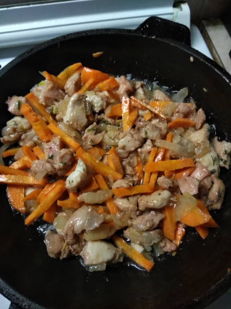 Добавим морковь и продолжим обжаривать до момента размягчения морковки.