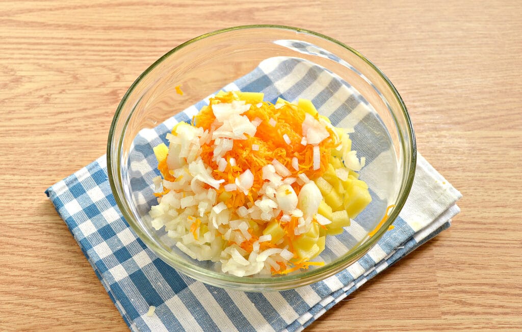 Для приготовления сочной начинки подготовим картофель, тыкву и лук. Данные ингредиенты очистим: картофель – от кожуры, тыкву – от кожуры и семечек, лук – от шелухи. Далее компоненты начинки измельчим. Состав разнообразим молотыми специями. Подробности – в этом рецепте с фото.