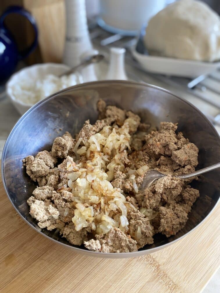 У меня печень уже подготовленная, вам нужно печень отварить и перекрутить через мясорубку. Печень выкладываем в миску, добавляем к ней обжаренный лук.
