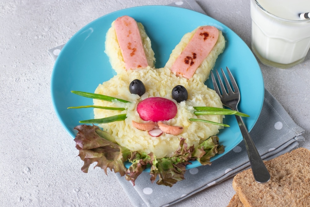 Из готового пюре формируем мордочку зайчика. Из слегка обжаренных сосисок выложим ушки, глазки из маслин. Носик сделаем из редиски и сосиски, а усики из лука. Вниз положим листик салата.