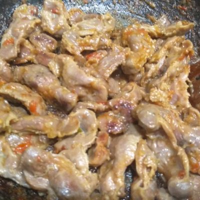 Перекладываем желудочки в сковороду к луку, добавляем 0,25 чайной ложки соды и 3 ст. ложки воды и перемешиваем.