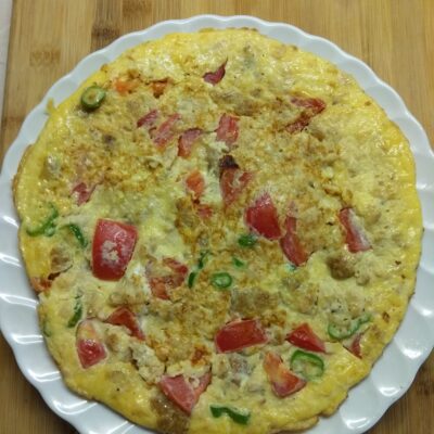 Чтобы красиво переложить омлет-релет, наложите на сковороду тарелку верх дном и резко, придерживая, переверните. Можно украсить домашним майонезом и свежей зеленью.