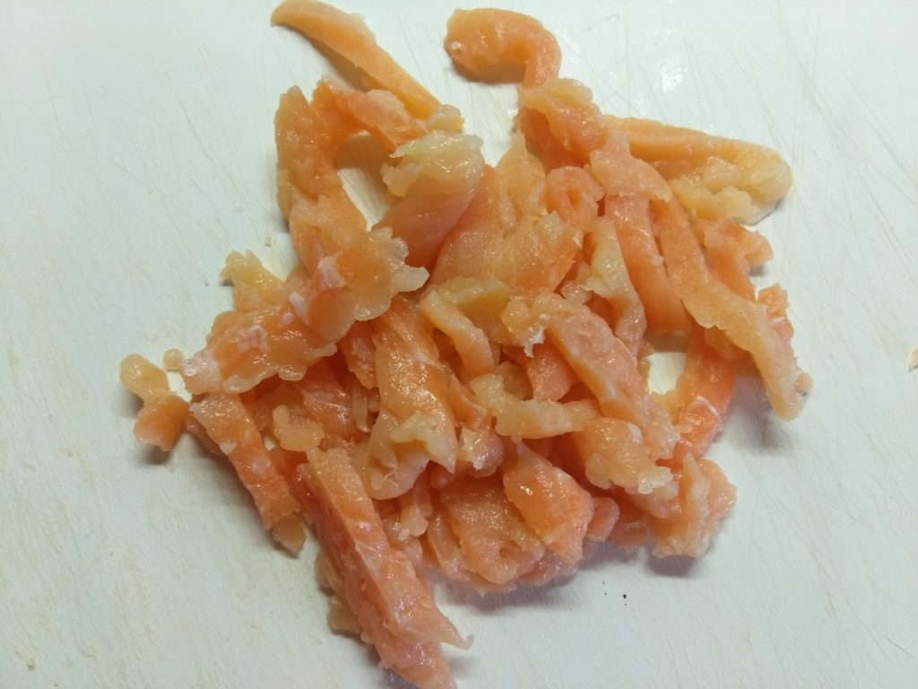 2. Пока спагетти варятся, нарежьте лосось тонкими ломтиками.