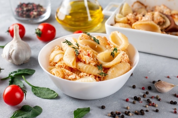Начну приготовления с самой пасты. Для этого блюда я выбрала конкильони. Отвариваю пасту в подсоленной воде до состояния аль денте и на время отставляю в сторону.