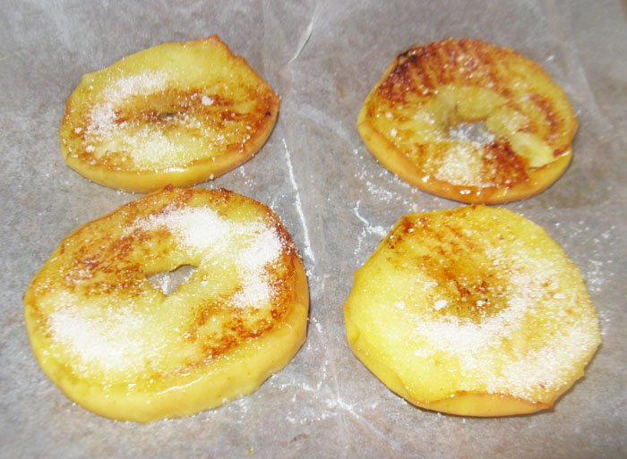 Жареные яблоки выложить на противень, присыпать сахаром или сахарной пудрой, запечь в духовке до карамельной корочки при температуре 160 С.