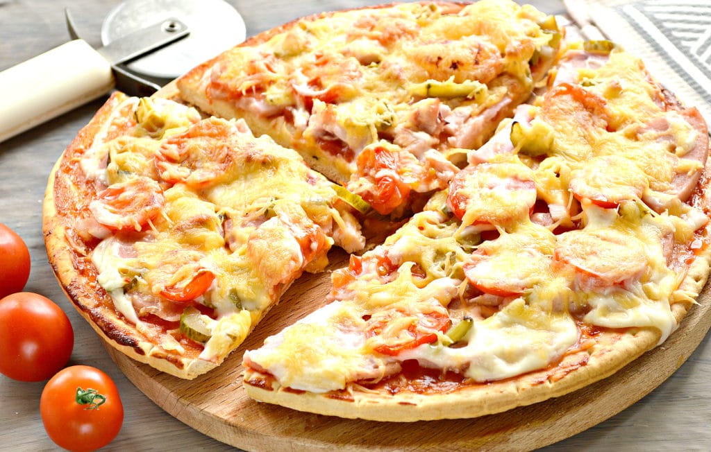 Для приготовления домашней пиццы возьмем уже готовый полуфабрикат – замороженную основу для пиццы. Начинка нашей пиццы – это кусочек копченой курочки (мясо взято с грудки, но подойдет и окорочок, бедро без кости), ветчина, маленькие помидоры черри, маринованный огурчик. И, конечно же, нам потребуется сыр твердых сортов. Приступаем.